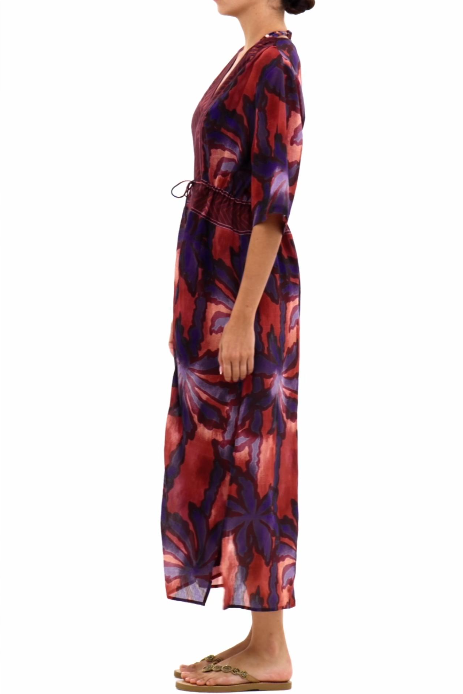 Long cover-up features a vibrant leaf print in shades of purple and copper. Tunic-style design incorporating a V-neckline and a waist tie makes it a versatile piece for beach or resort outfits. Natural drape adds movement.