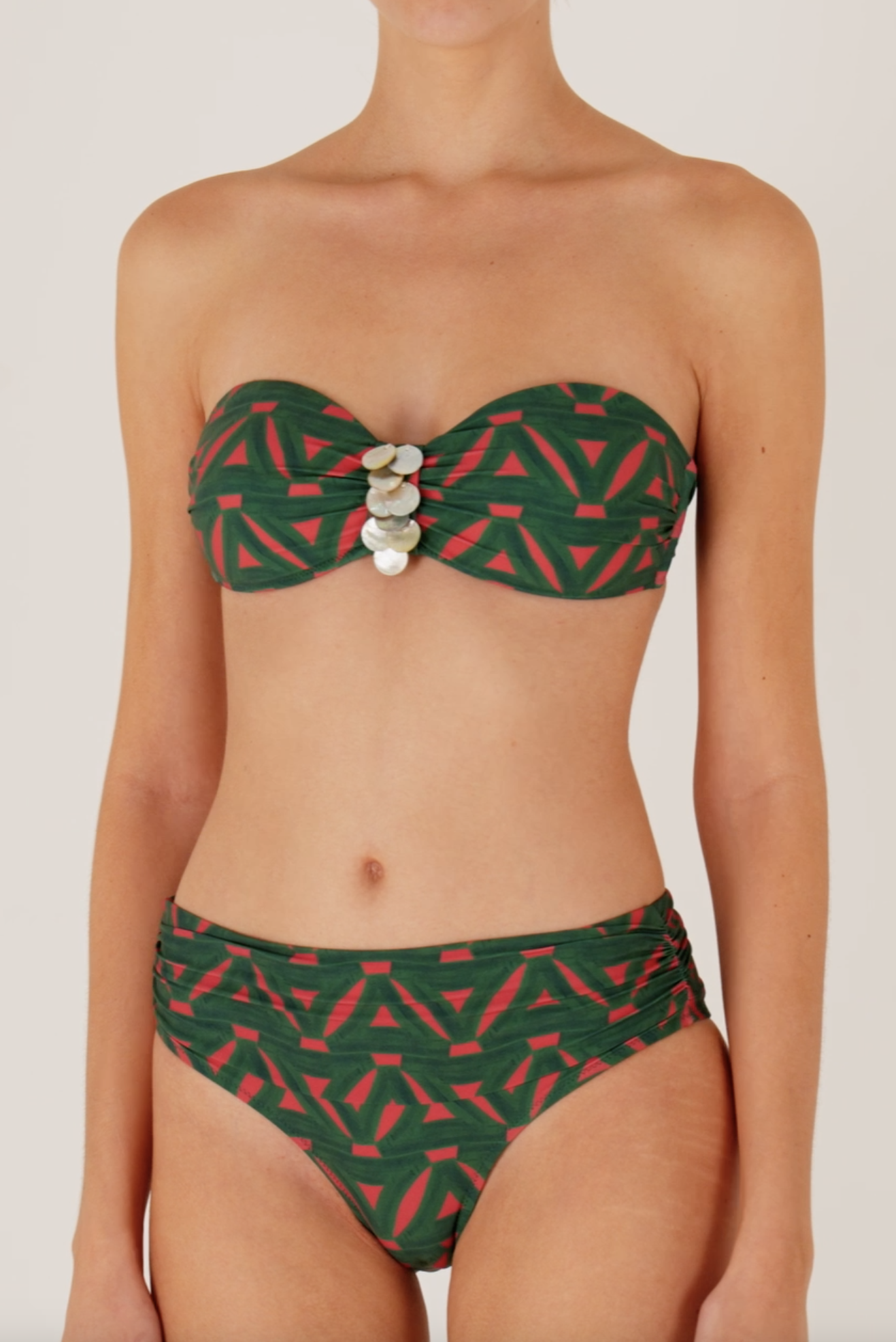 A strapless bandeau bikini top with a sweetheart neckline and refined appliqué details. A blend of elegance and comfort.