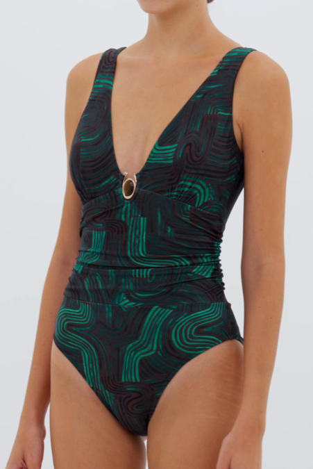 One-piece swimsuit features a halter design, plunging neckline, and central accessory. Radiant wave print ensures a distinguished presence and style.