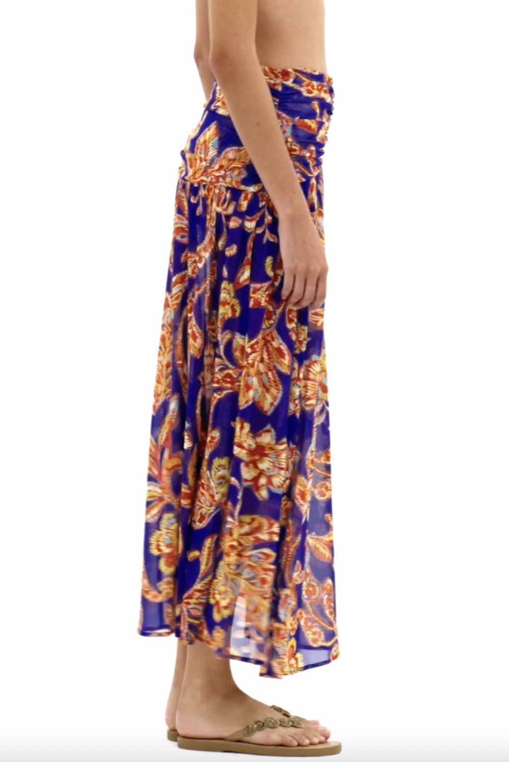 Long skirt features a dynamic paisley-inspired print. Elastic waistband plus a flowing silhouette offer a comfortable presence full of movement. Resort looks and special occasions benefit from this style.
