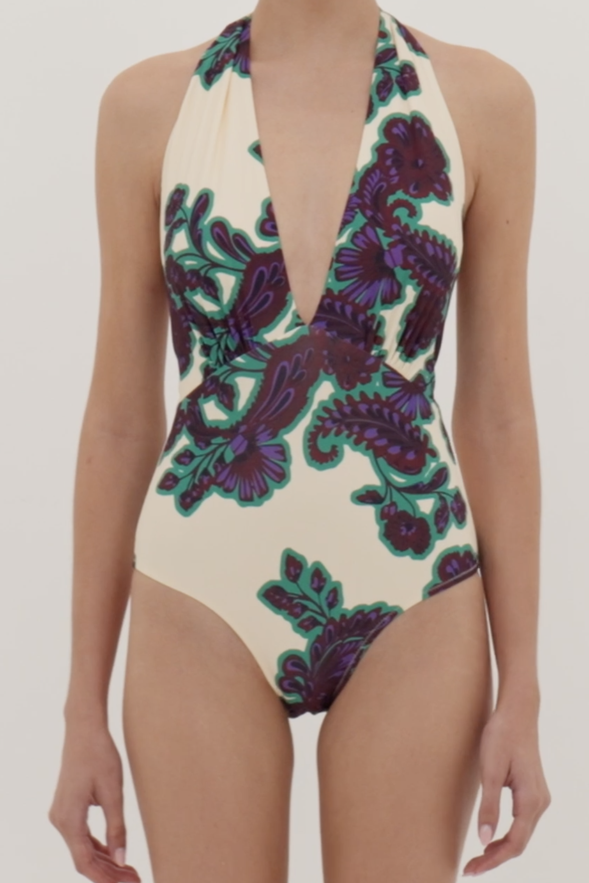 The one-piece swimsuit, with its striking floral print on a light background, features a plunging V-neckline and wide straps that offer a good fit. Removable cups allow for personalized support, while the low V-back adds a distinctive touch. Its small coverage is ideal for summer.