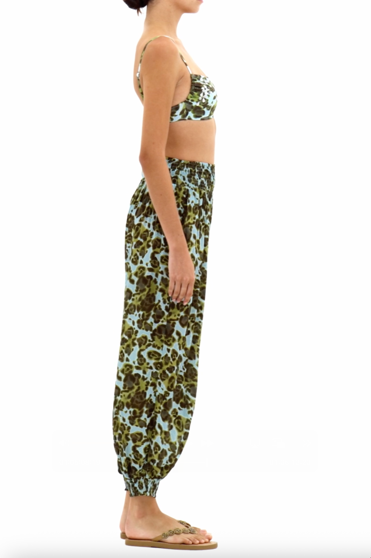 Beach pants Cirila follows a straight and wide-cut model combining freedom of movement and the comfort of an elastic waistband. Design highlights an integrated botanical pattern, projecting an image of absolute well-being. Selected technological fibers guarantee an impeccable natural drape plus a very soft texture on the skin. Key piece forms a highly distinguished coordinated set highlighting authenticity.