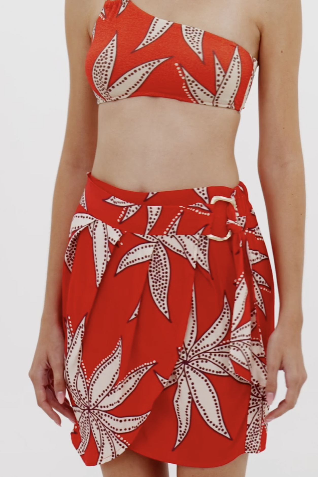 The short pareo skirt, a versatile beach garment, showcases the distinctive red and off-white botanical print on a very lightweight fabric. Its wrap-around, adjustable design offers multiple styling options and an accent of bohemian style to your summer attire.