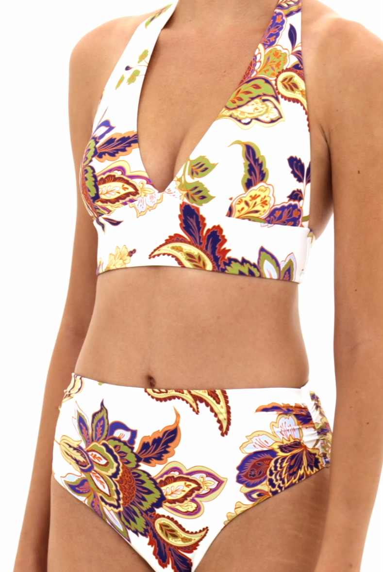 Halter-style bikini top features a wide underbust band for enhanced support. Radiant design showcases a botanical print in warm tones and purple to create a distinguished look.