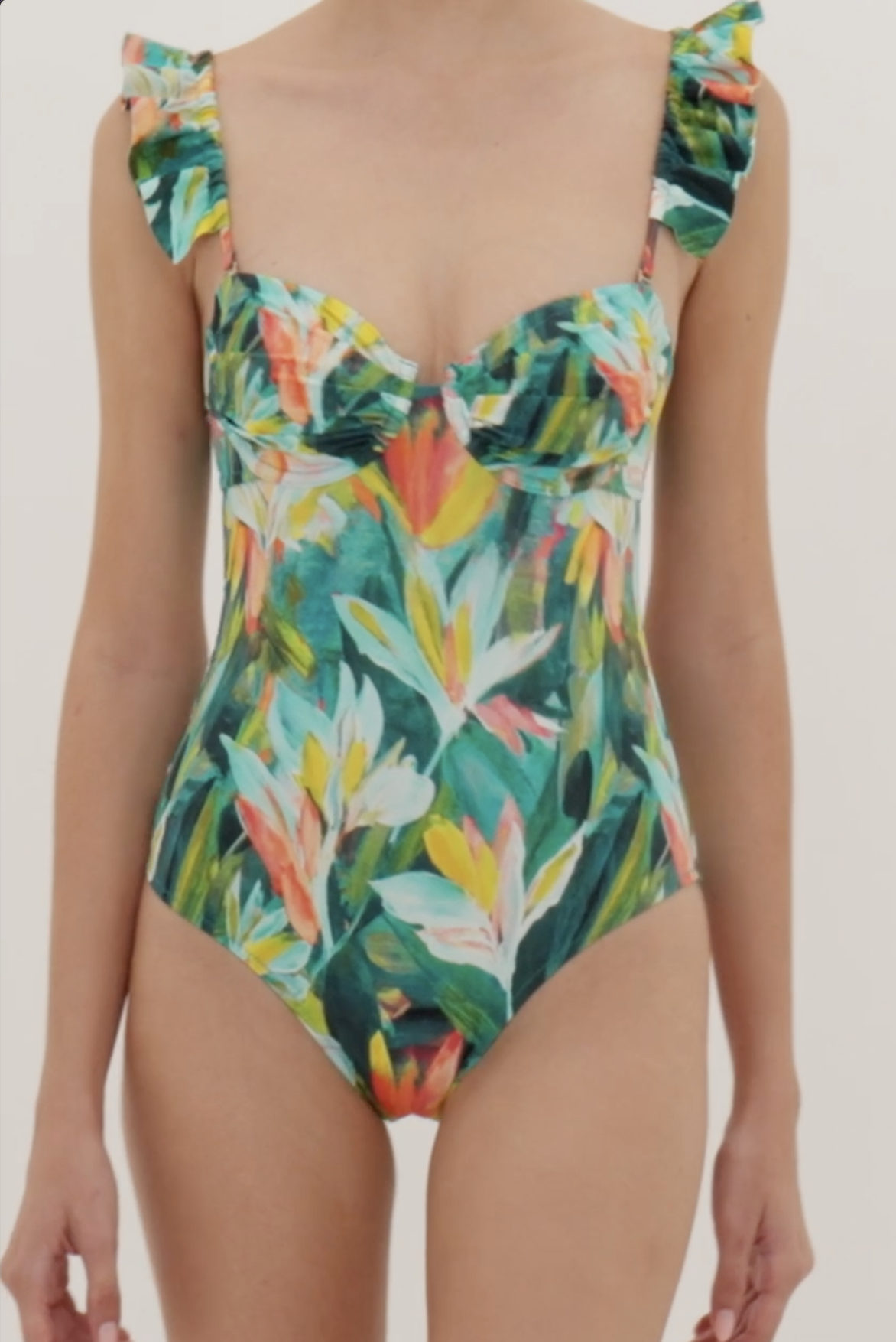 The corset-style one-piece swimsuit, with its multicolor floral print, offers a structured design. Removable straps and ruffle, underwire, and cup draping complement the figure. Low back with clasp and medium coverage ensure a comfortable presence.