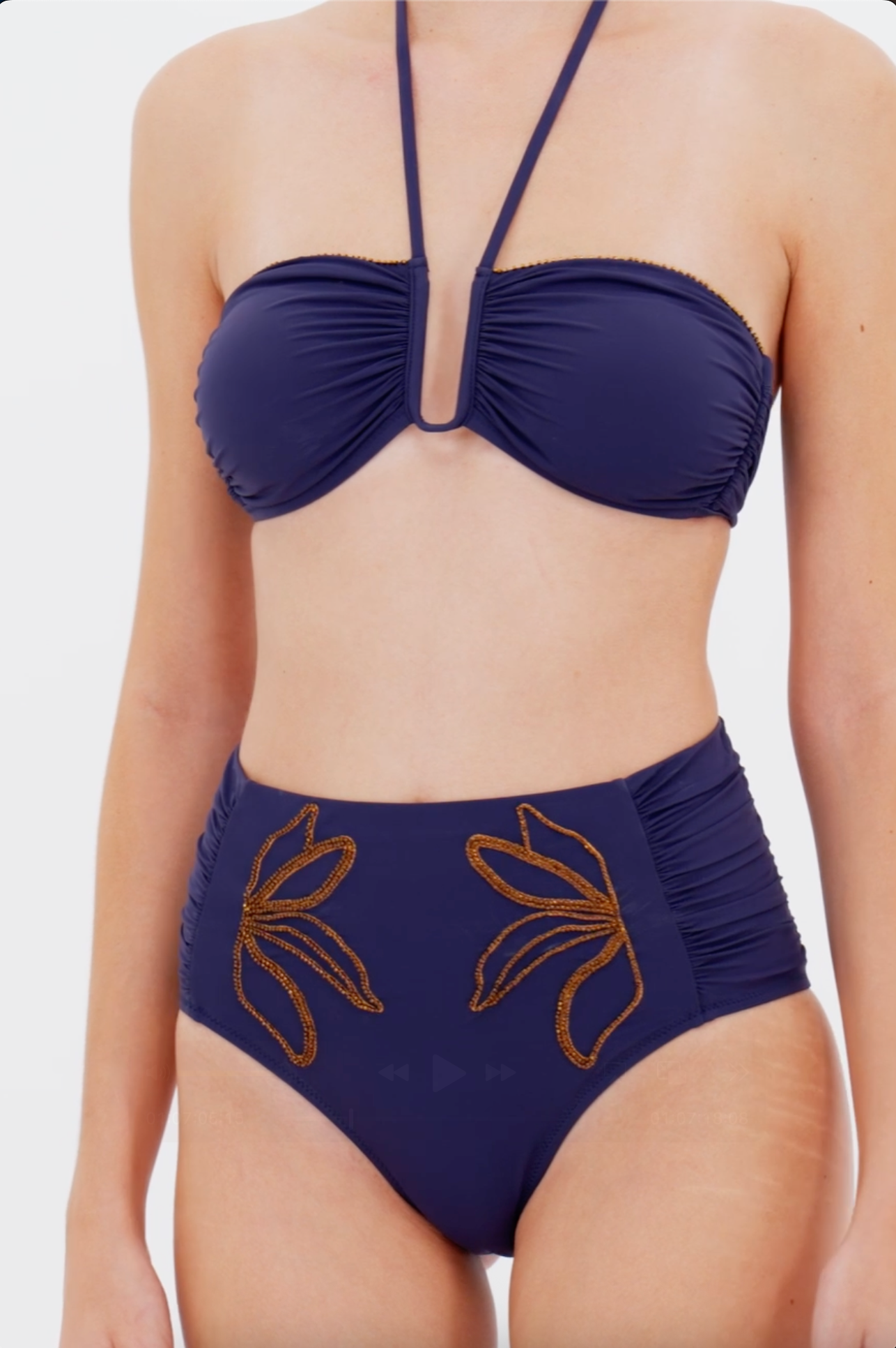 Calzón de bikini alto Pipa, en azul marino con motivos florales dorados, presenta recogidos en los costados y bordado con chaquira en la parte frontal. Su corte alto y costuras invisibles brindan un porte cómodo y cobertura media.