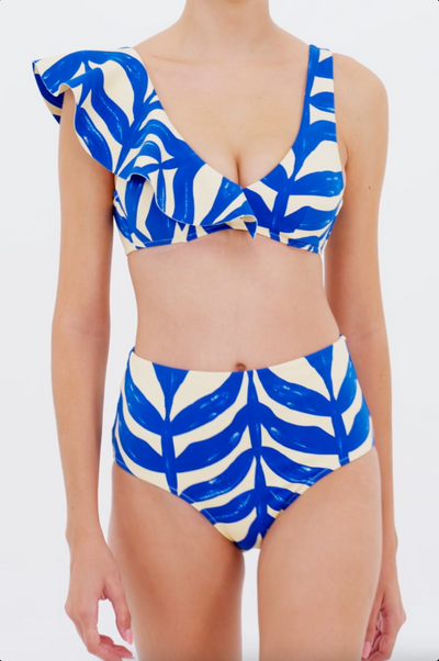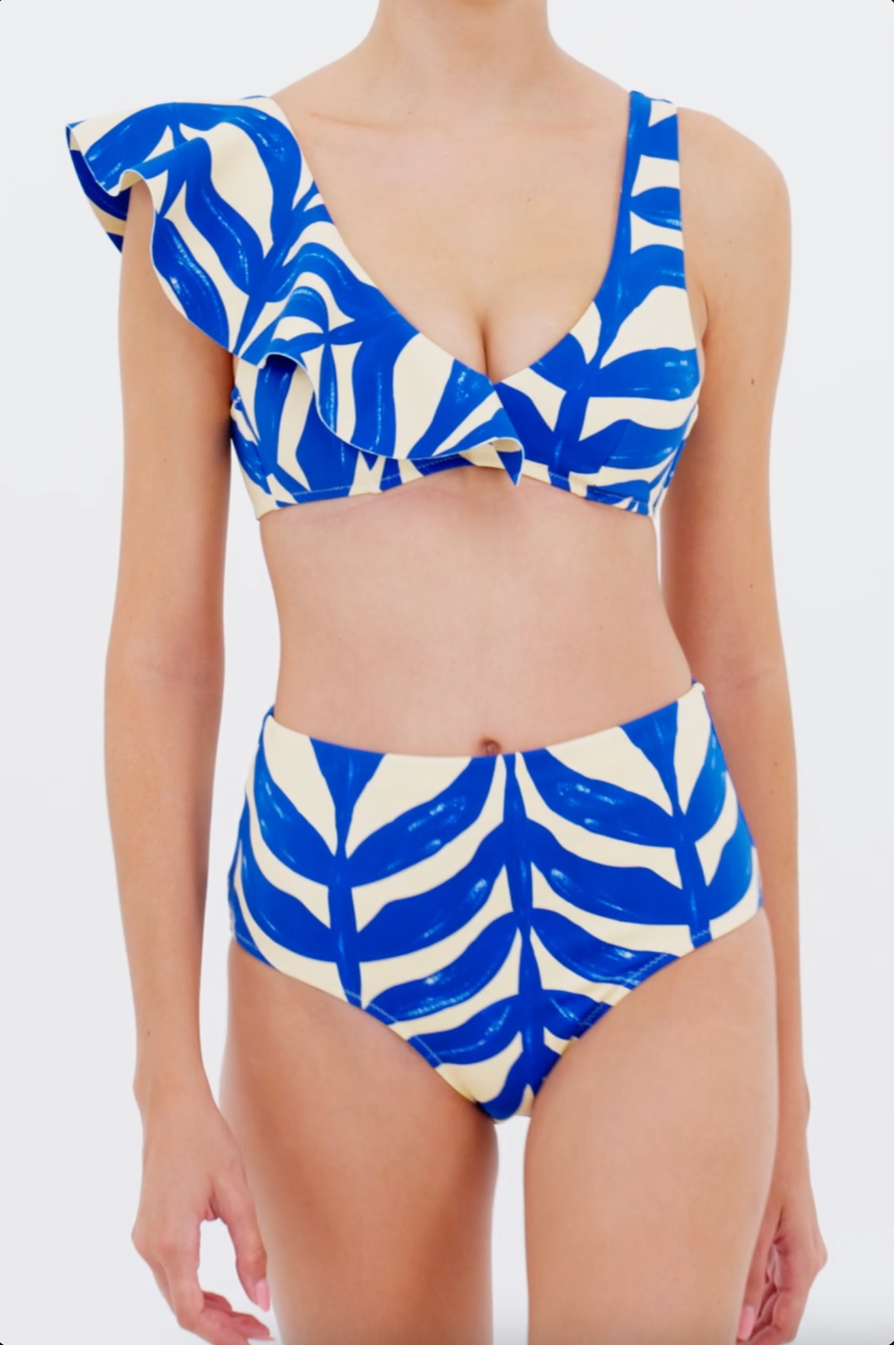 Calzón de bikini Ipanema, con sus ondas azules y blancas, presenta un talle alto y costuras invisibles en la parte inferior. Su cobertura amplia brinda un porte cómodo y seguro, ideal para un look playero depurado.