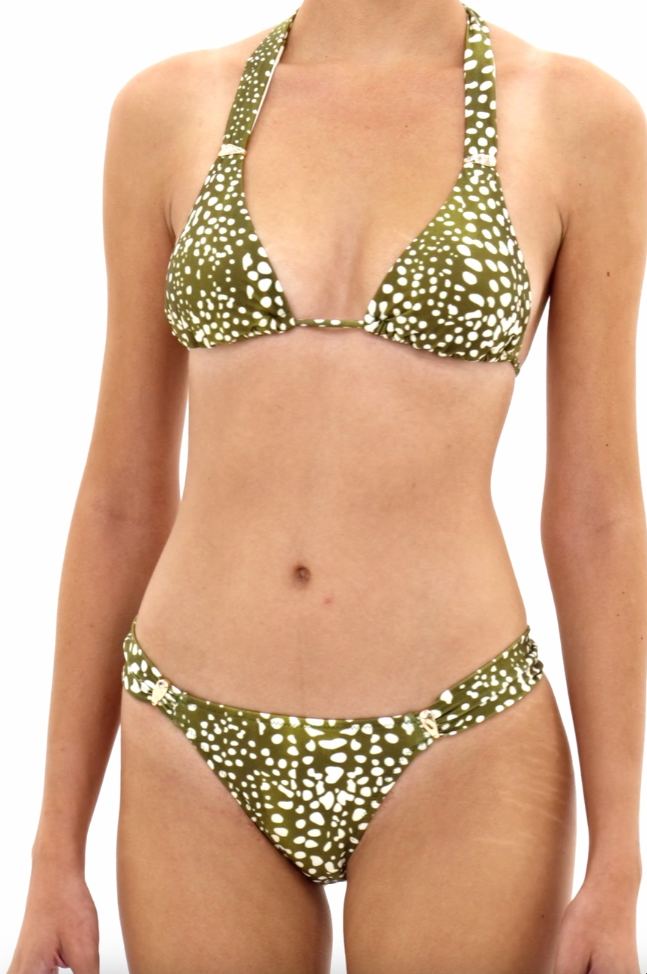 Parte inferior de bikini Nenufar con un estampado orgánico en tonos verdes. Se define por sus costados drapeados que añaden textura y volumen, y avíos metálicos. Su corte y cobertura equilibran confort y un porte actual.