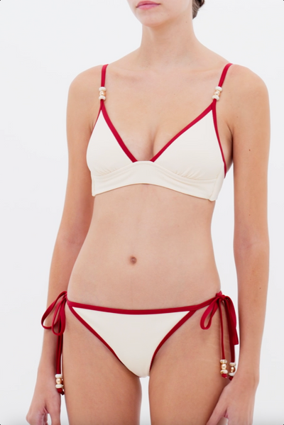 Calzón de bikini en tono blanco marfil, ribeteado en rojo oscuro, con detalles de piedras doradas en los extremos de las tiras laterales. Su corte a la cadera y el diseño de tiras laterales ofrecen un ajuste personalizable y un estilo que define la silueta.