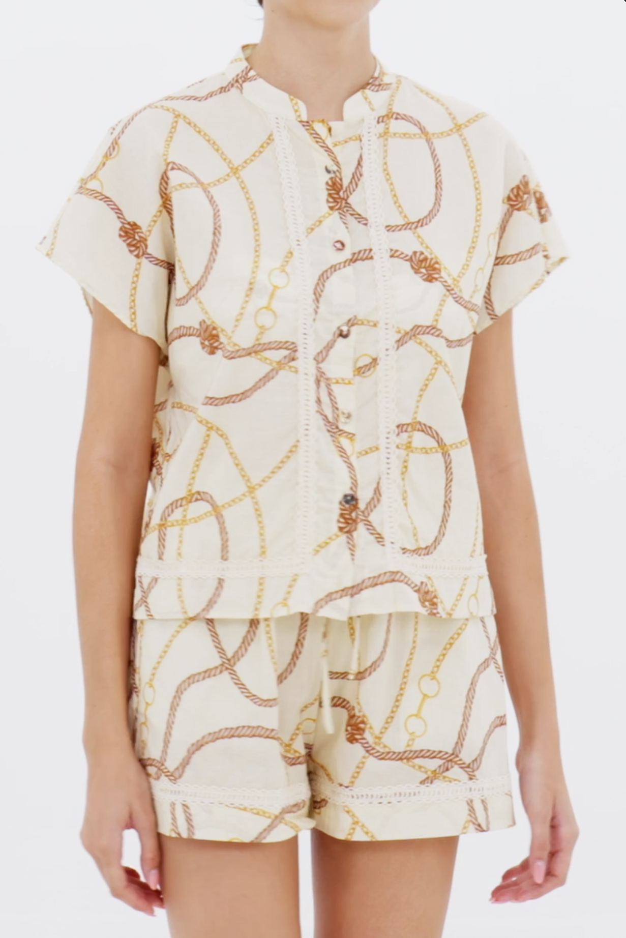 Camisa Do Reis en blanco marfil con un diseño de trazos dorados presenta mangas cortas y cuello mao. La tira bordada al frente y en la espalda añade un toque especial. Es una prenda de algodón, ideal para combinar con atuendos de playa.