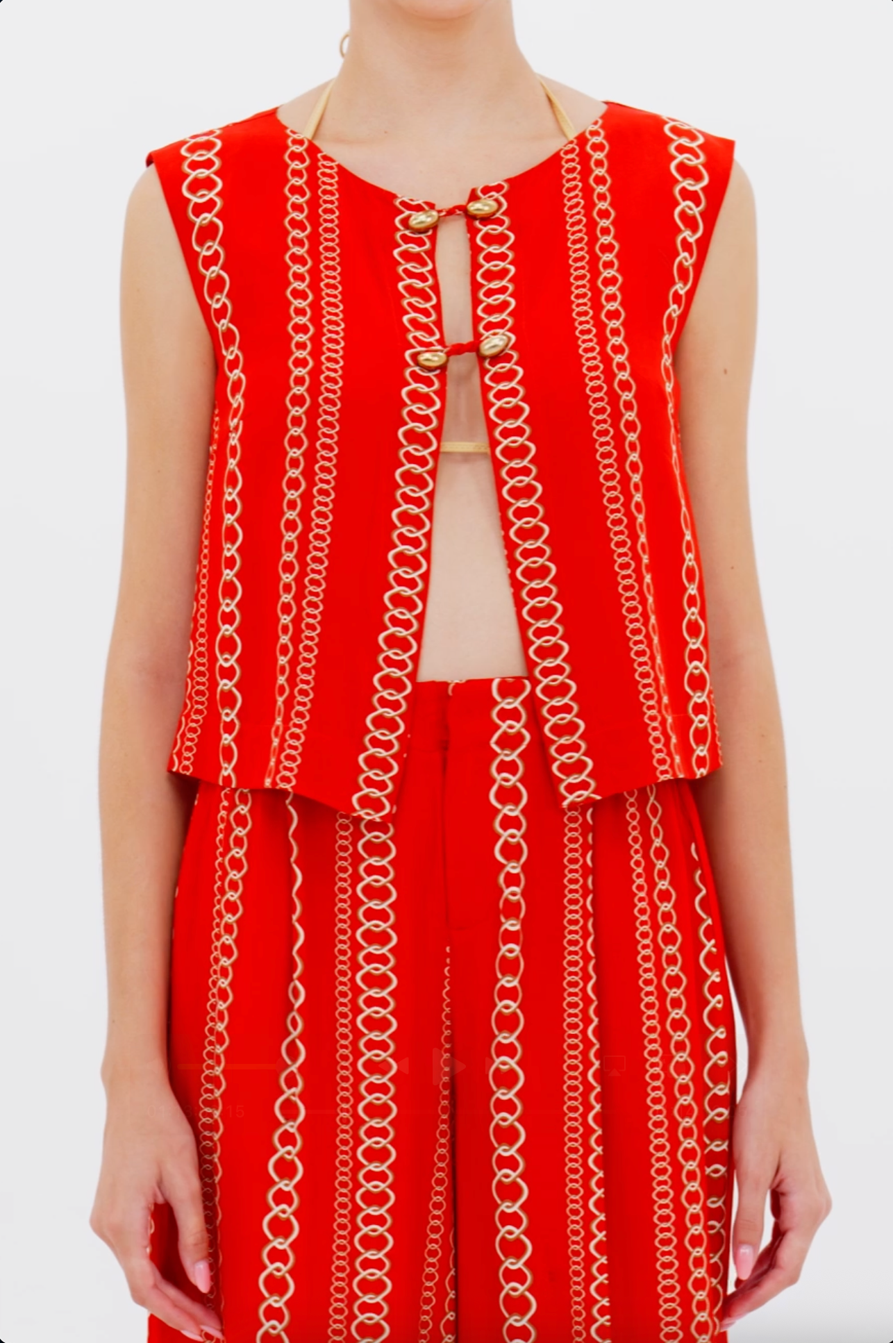 Chaleco Itakare, en rojo con un estampado de cadena dorado, presenta un diseño sin mangas y escote redondo. Sus ojales con botones dorados y cordones entrelazados le otorgan un toque único.