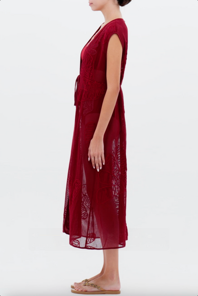 Cover Up largo Caraiba Wine, en tono vino, es una pieza con un diseño detalles bordados.