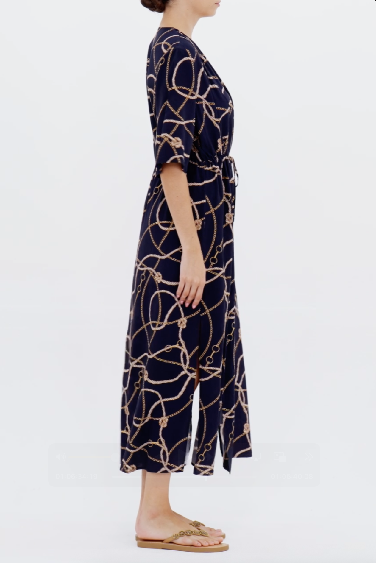 Cover up largo Do Reis, en azul oscuro con un diseño de trazos dorados, es una prenda amplia y de gran caída. Sus mangas cortas y jareta en la cintura del mismo material le otorgan un aire bohemio y un ajuste personalizado. Una pieza que irradia estilo y comodidad.