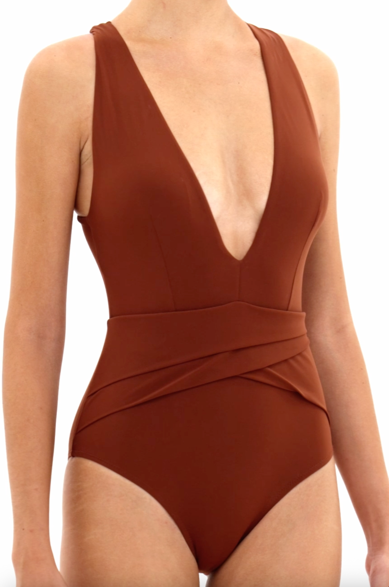 Traje de baño completo con escote profundo y tirantes cruzados. Diseño en tono terracota que asegura bienestar y presencia protagonista en el resort.