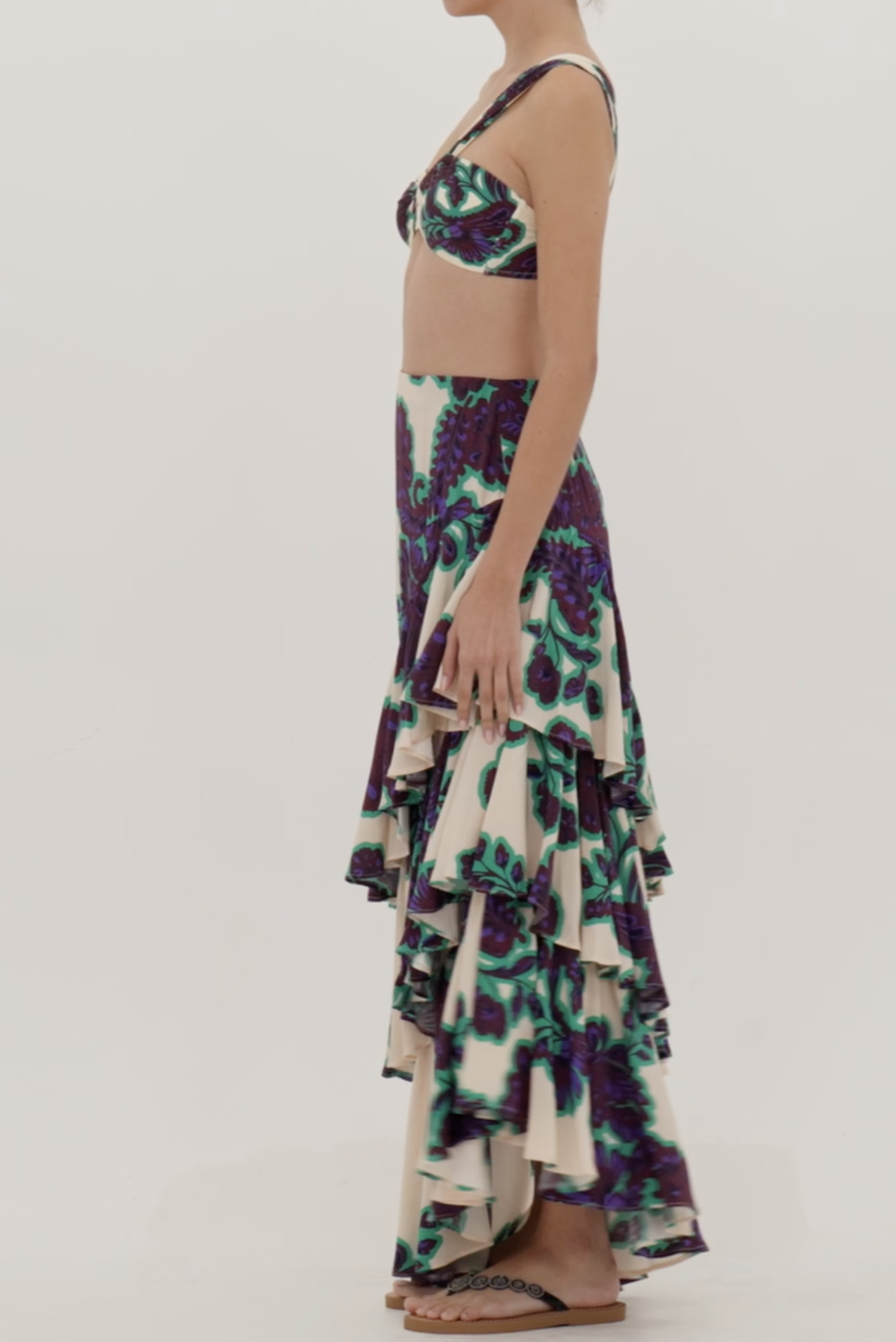 Falda larga con estampado floral sobre fondo claro y diseño asimétrico, una pieza que brinda movimiento. Las capas en cascada crean una silueta dinámica, mientras el cierre posterior y el corte alto aseguran un ajuste impecable. Su tejido ligero es perfecto para ocasiones especiales.