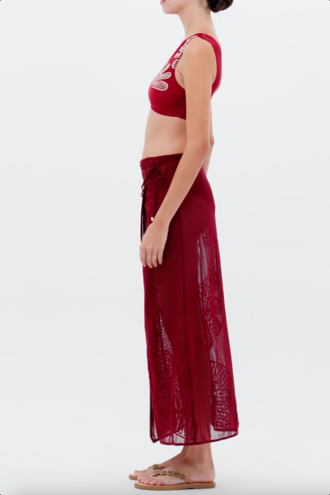 Falda Pareo Caraiba Wine, en un tono vino, es una prenda con bordado floral y detalles de cuentas en los pliegues. Es el complemento perfecto.