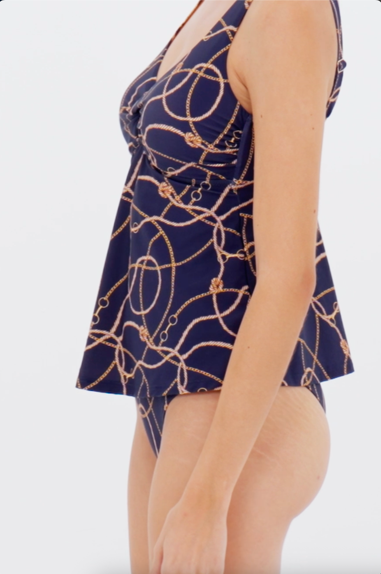 Tankini Nudo Do Reis, en azul oscuro con un diseño de trazos dorados, presenta un nudo en el frente y breteles amplios ajustables. Su espalda alta y tajos laterales le otorgan un porte cómodo. Es una pieza versátil y de diseño para un look de playa único .