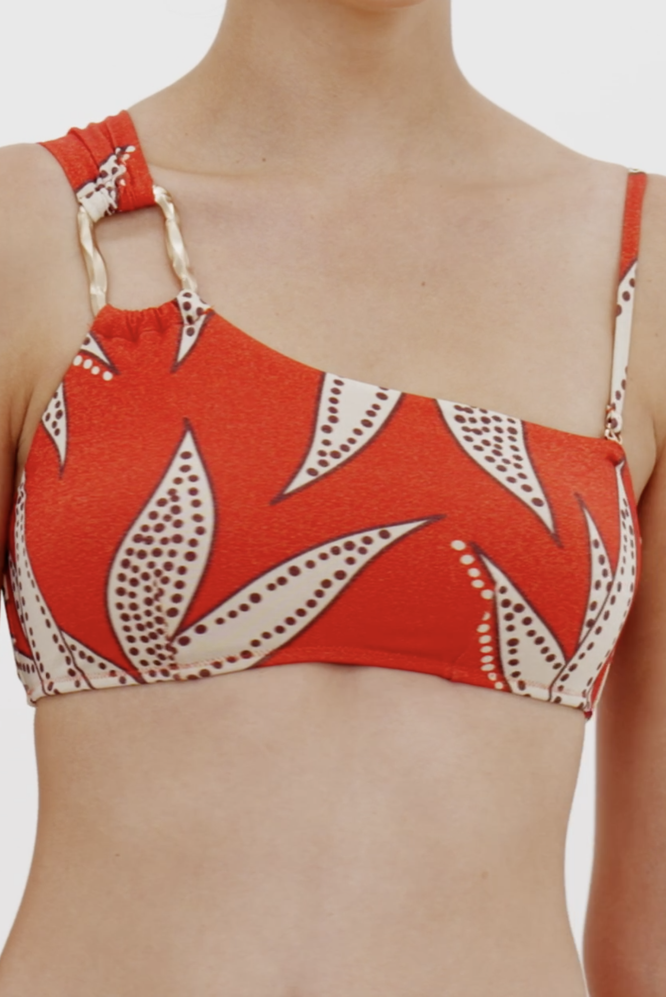 El Top de bikini a un hombro es una pieza con diseño asimétrico, presenta un vibrante estampado botánico rojo. El tirante único se presenta con una hebilla de inspiración natural, aportando un detalle singular. Una creación que fusiona actualidad y un encanto orgánico para un porte distinguido.