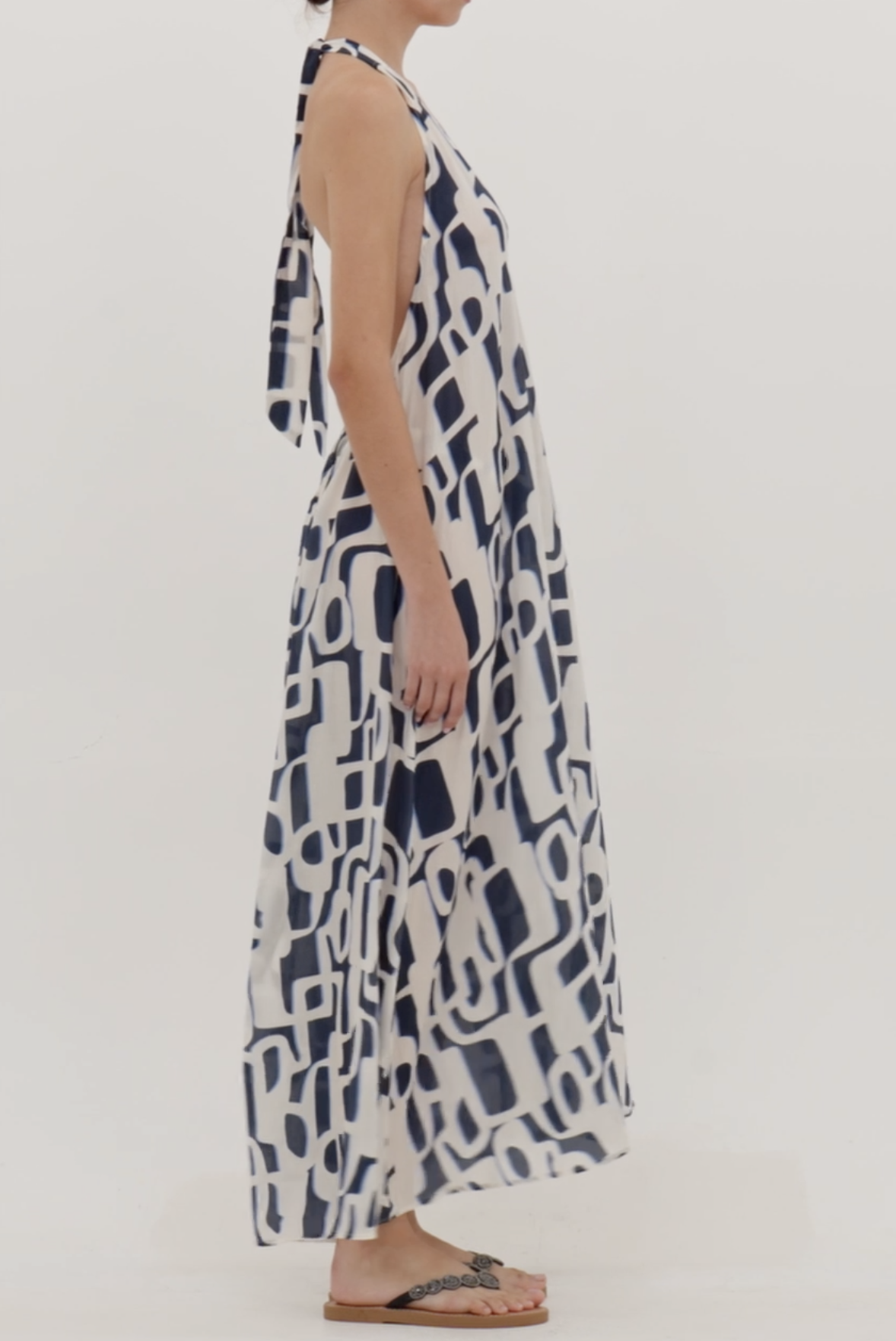 Vestido largo, con estampado artístico en azul y blancos marfil, presenta un diseño halter con amarre al cuello que realza los hombros. El escote en V y la espalda descubierta aportan un aire fresco, mientras el elástico fruncido en la espalda baja asegura un ajuste cómodo. Su tejido de fibras naturales ofrece una caída suave.